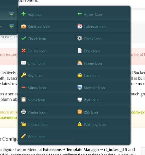 Fusion has support for individual menu icons for its dropdown menu items. These images are loaded from the /templates/rt_infuse_j15/images/menus/ directory where you will find 31 images by default.