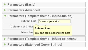 To add your own Subtext, go to Menu → Mainmenu → Select/Create a Menu Item. Locate the Subtext field in Parameters (Template theme - infuse-fusion) and insert your desired text.